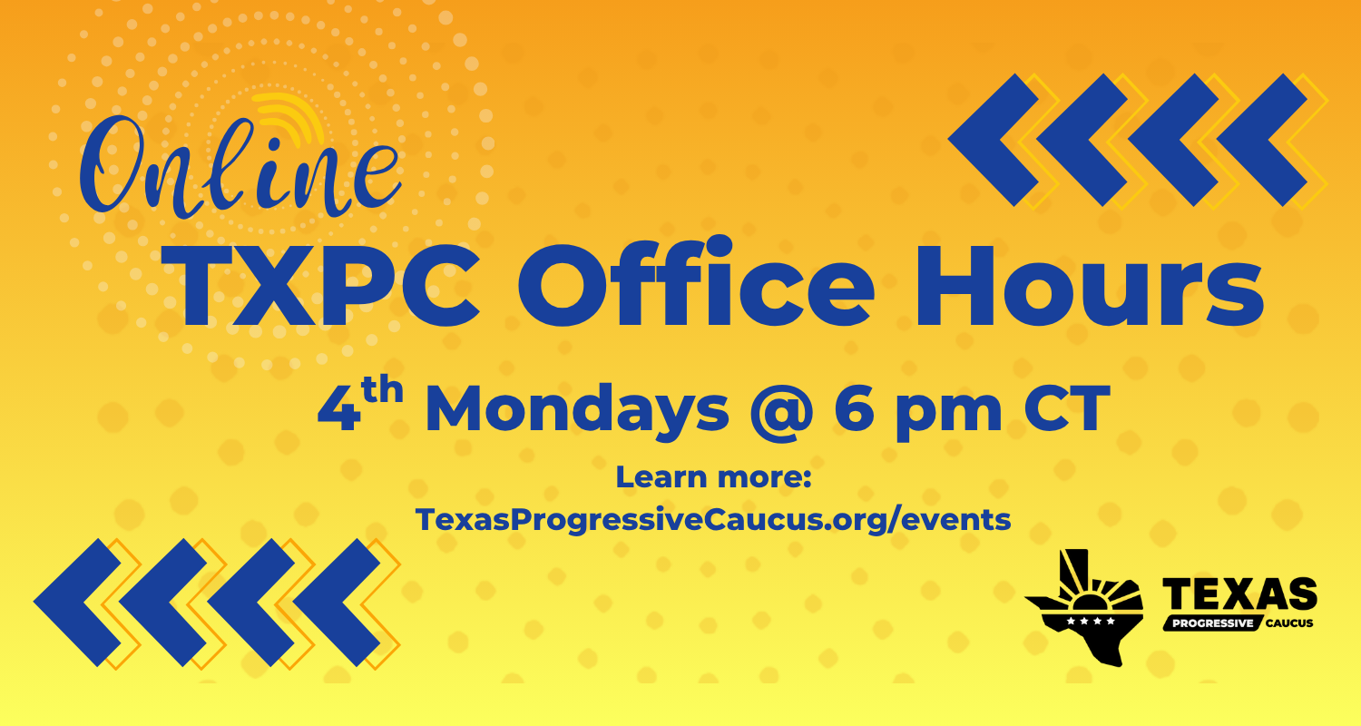 TXPC is now holding office hours! Whether you have a question for our team, are interested in joining our progressive movement, hear our latest updates, or just want to share an idea, we welcome you to join us.
